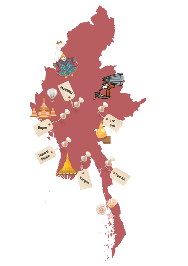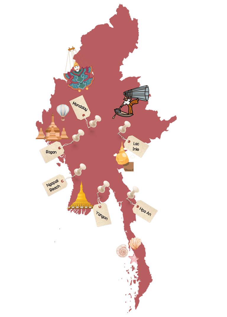• Le lac Inle : Plongez dans la vie quotidienne des pêcheurs locaux et découvrez leurs techniques uniques de pêche à une jambe. Ainsi que les cultures uniques au monde.